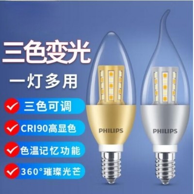 e14螺口led灯泡三色变光超亮蜡烛灯泡拉尾水晶小螺口吊灯家用节能 三色变光【6.5瓦金底拉泡】12只